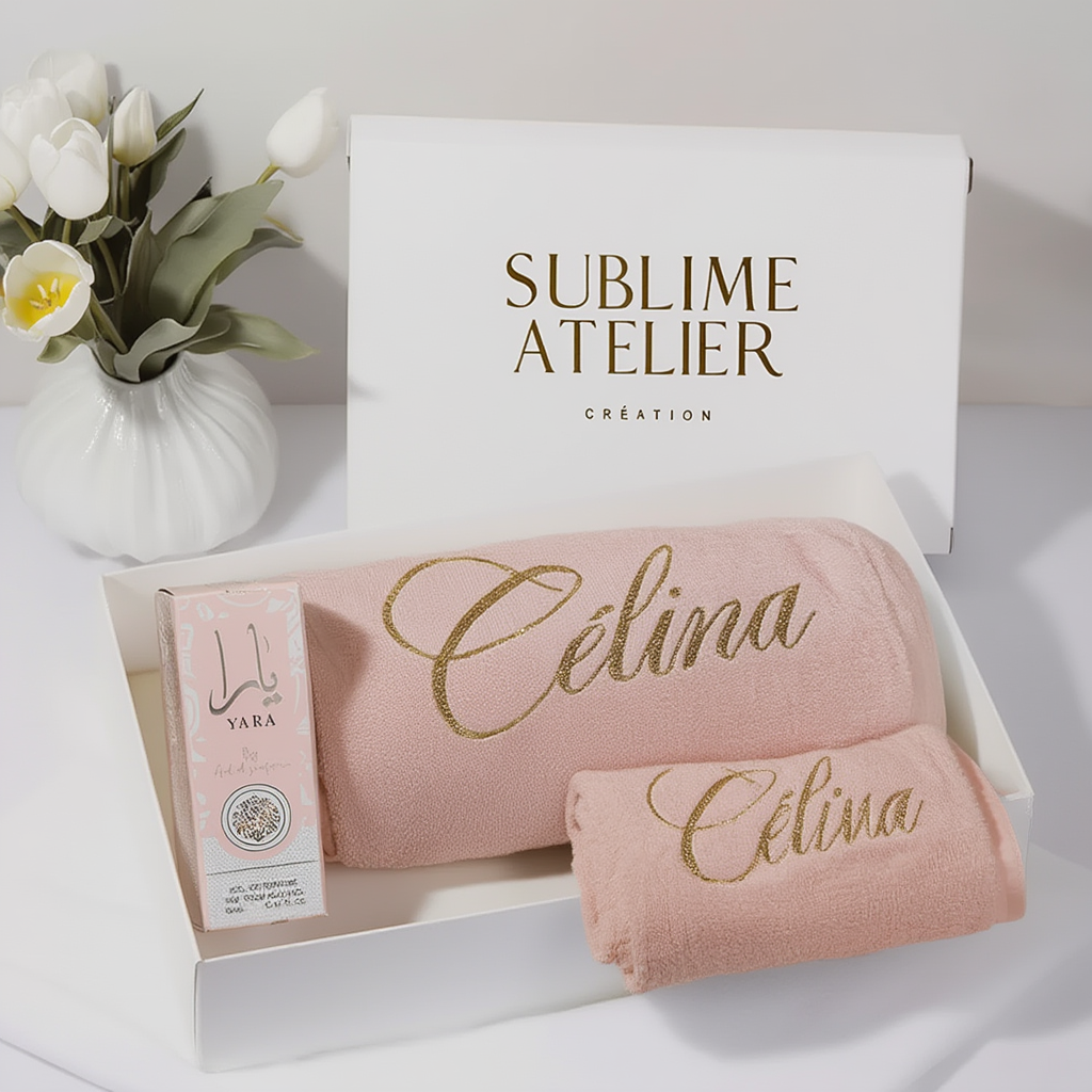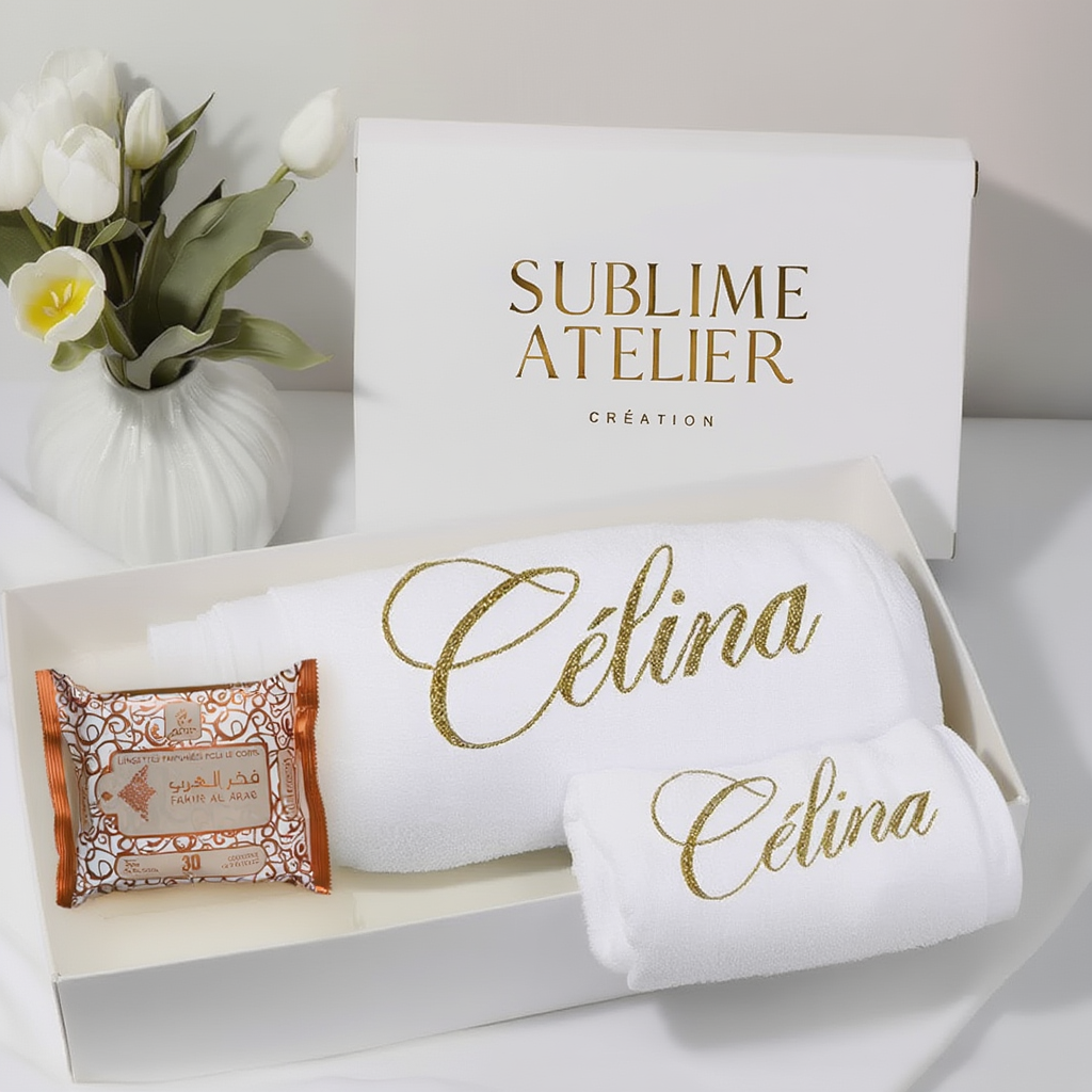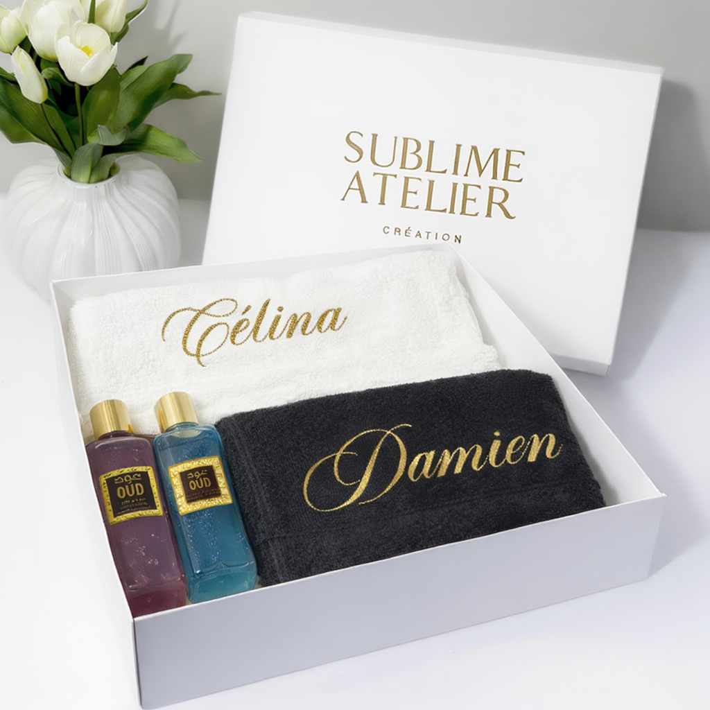 Un coffret raffiné pour l’homme, alliant confort et élégance. Serviette et gant noirs personnalisables, accompagné d’un gel douche et d’un musc pour un moment de bain luxueux et relaxant.