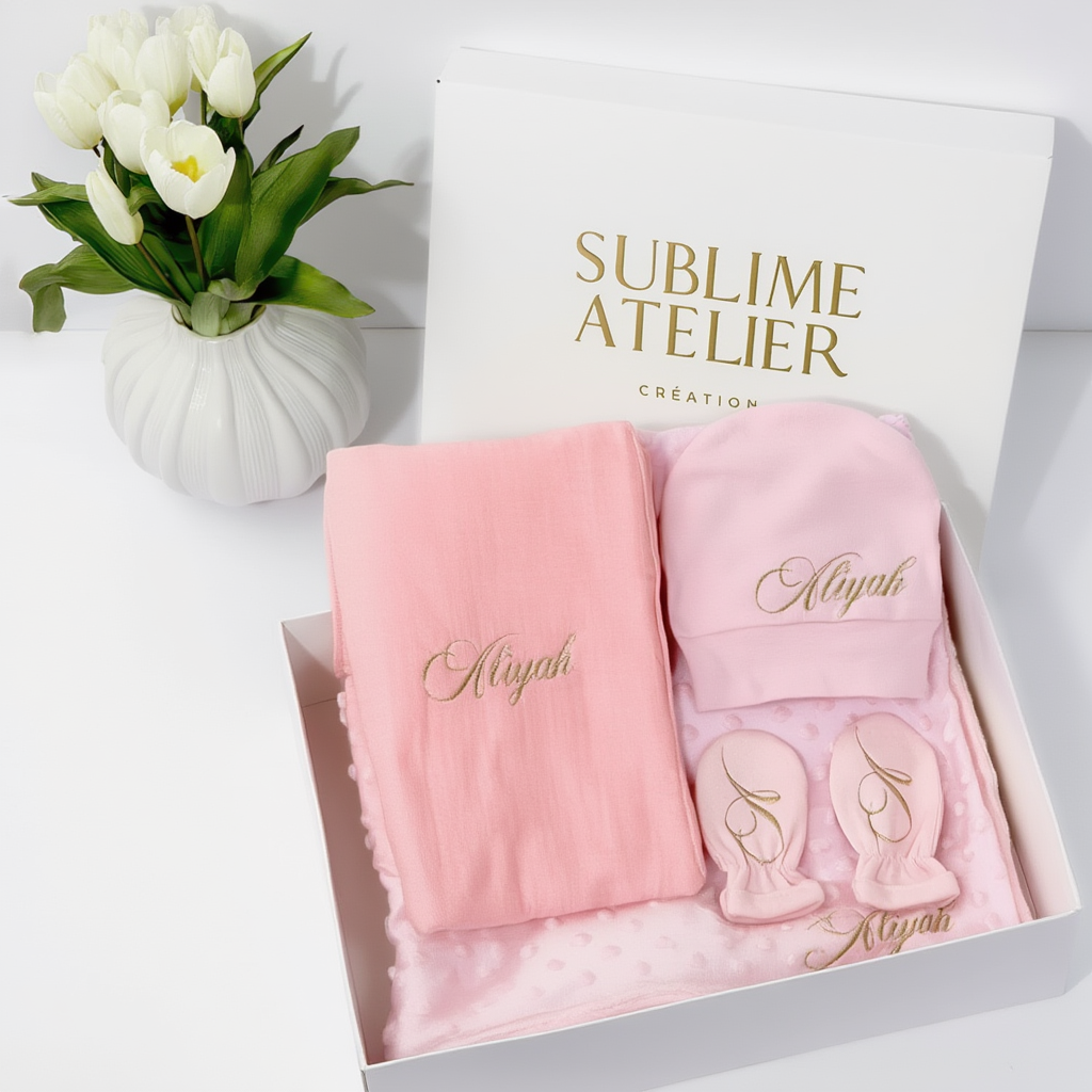 Un coffret naissance raffiné et complet, pensé pour offrir douceur et élégance dès les premiers jours. Personnalisez-le pour un cadeau unique et mémorable.